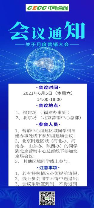 2021年6月5日,福建中电合创电力科技有限公司北京营销中心总部正式启用暨月度营销大会顺利召开。本次月度例会场次分为福建场和北京场,福建场由营销中心副总经理陈赛荣同学主持,北京场由营销中心总经理助理陈进炎同学主持。